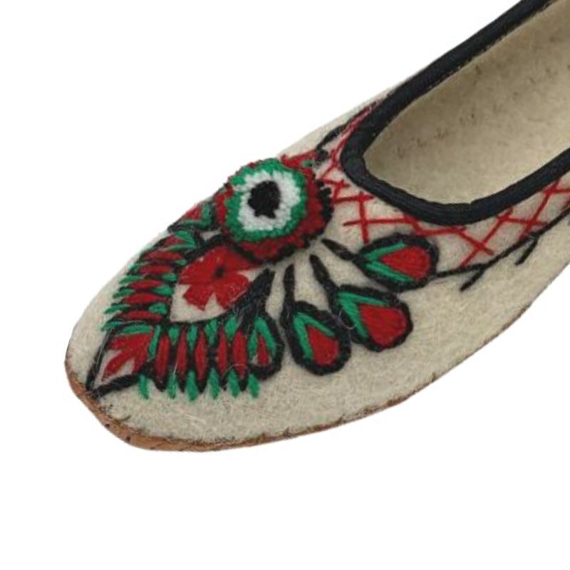 Tradycyjne góralskie  ręcznie wykonane kapcie z wełnianego sukna, ozdobione ręcznym haftem w kształcie parzenicy.