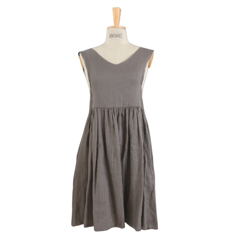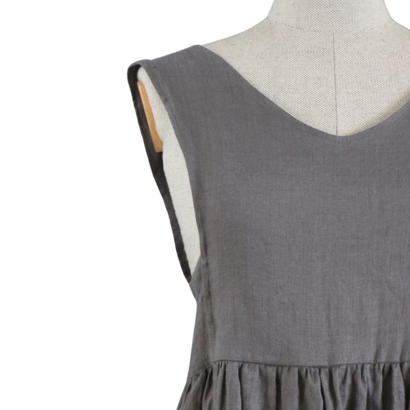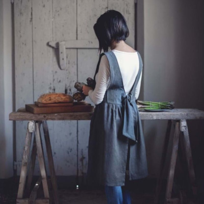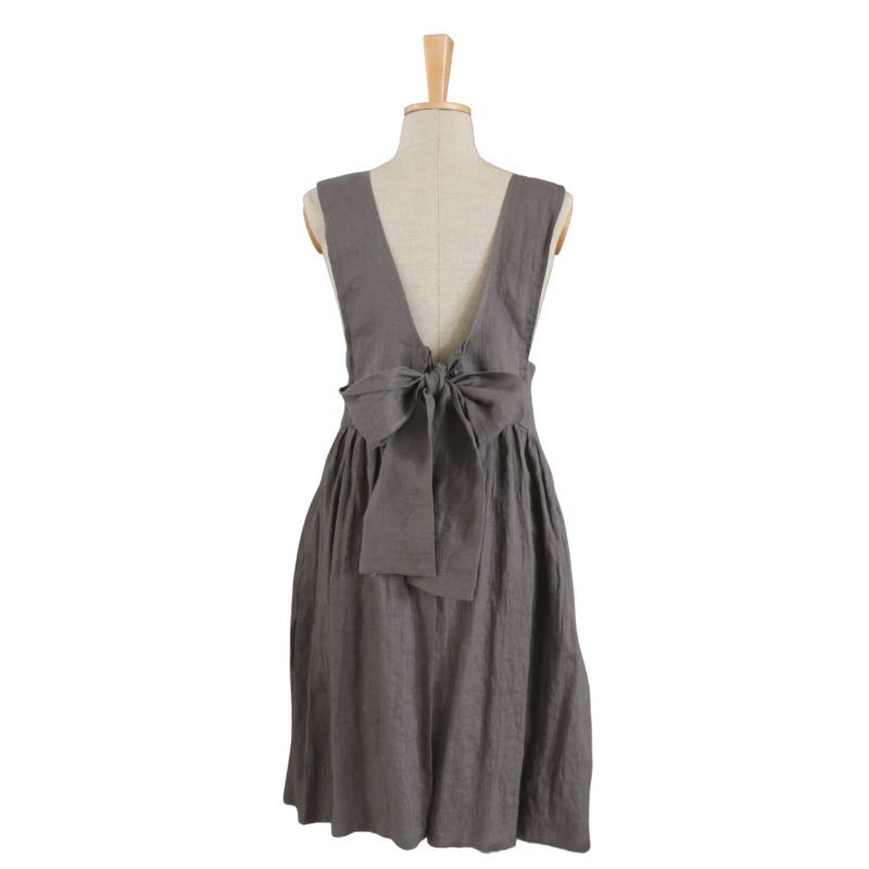 Fartuch uszyty z lnu, z tyłu posiada wycięcie na plecach.
