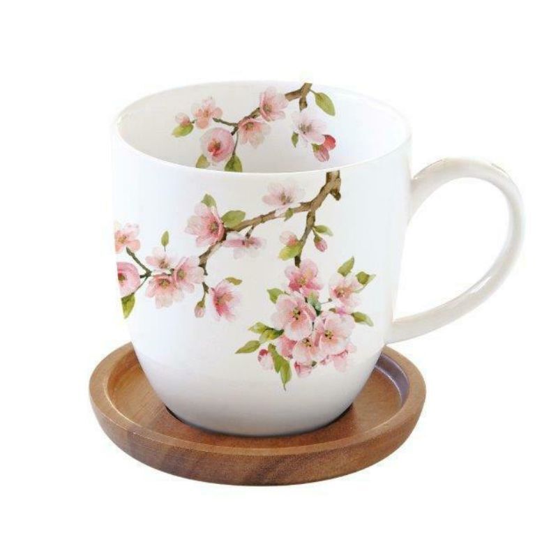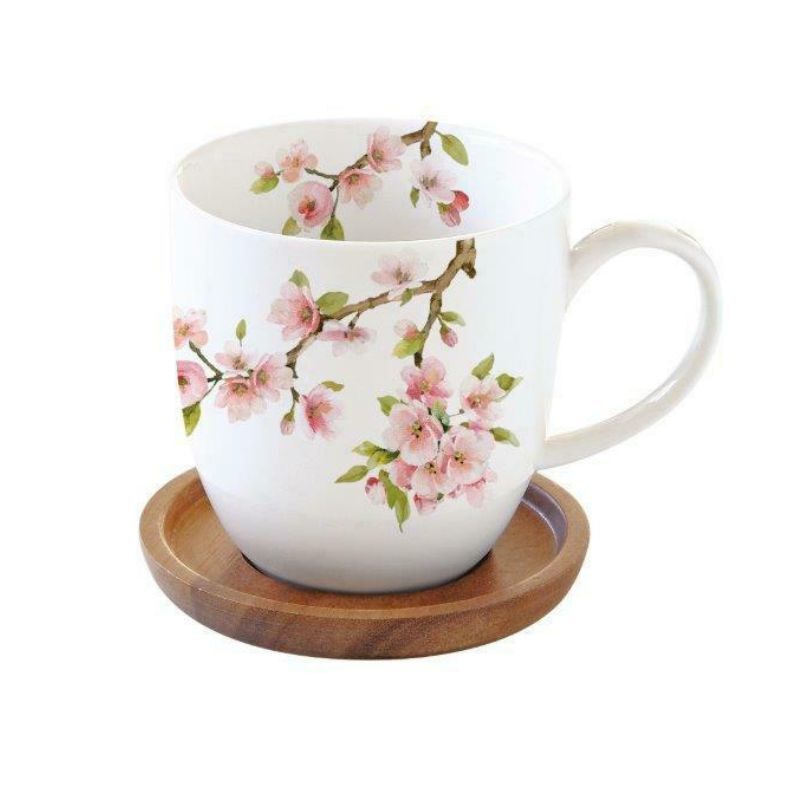 Kubek wykonany z porcelany z motywem delikatnych, kwitnących gałęzi.