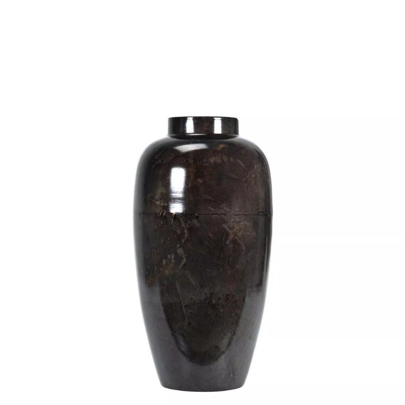 Wazon wykonany z metalu, w kolorze ciemnego brązu, celowo postarzany.