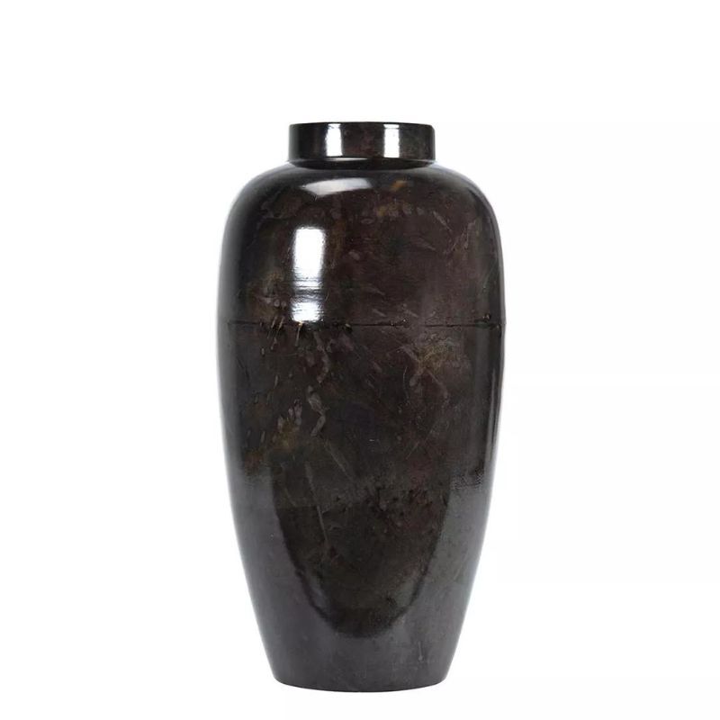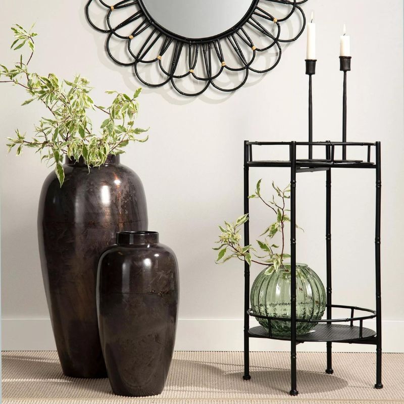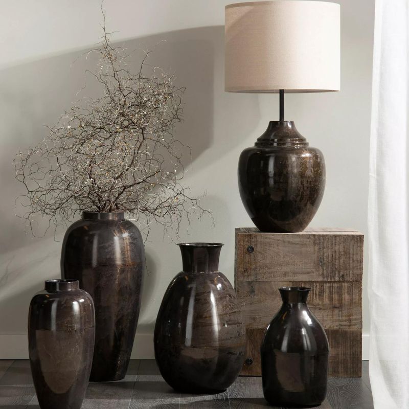 Wazon wykonany z metalu, w kolorze ciemnego brązu, celowo postarzany.