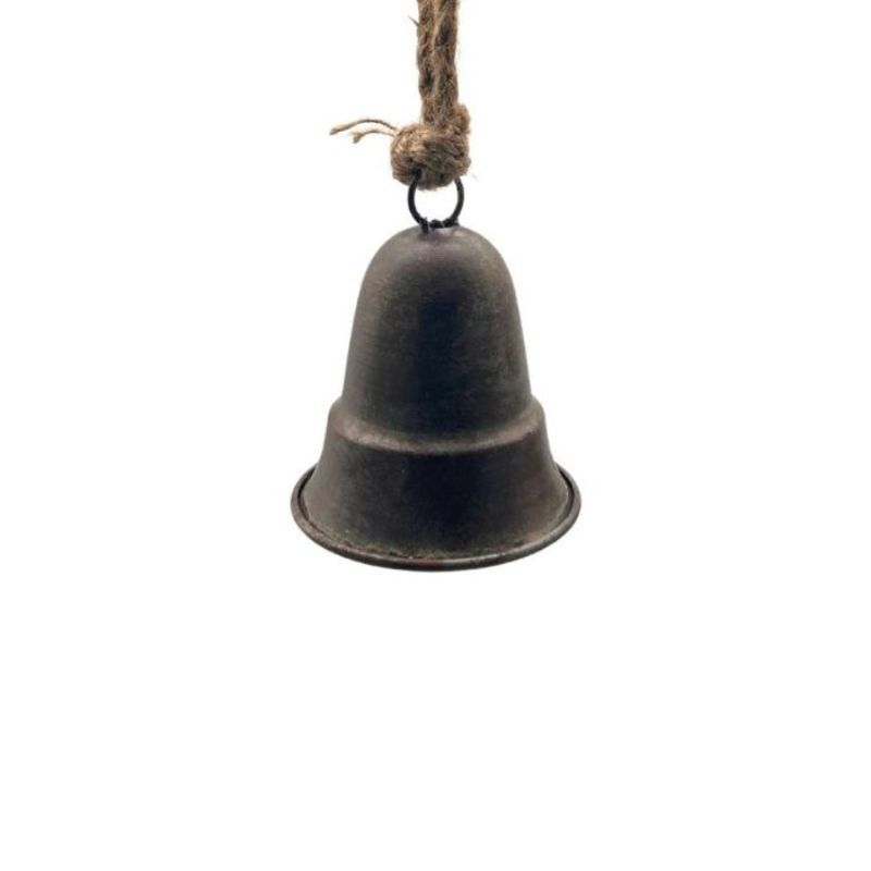 Dzwonek metalowy postarzany, zawieszony na jutowym sznurku.