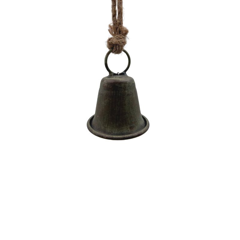 Dzwonek metalowy postarzany, zawieszony na jutowym sznurku.