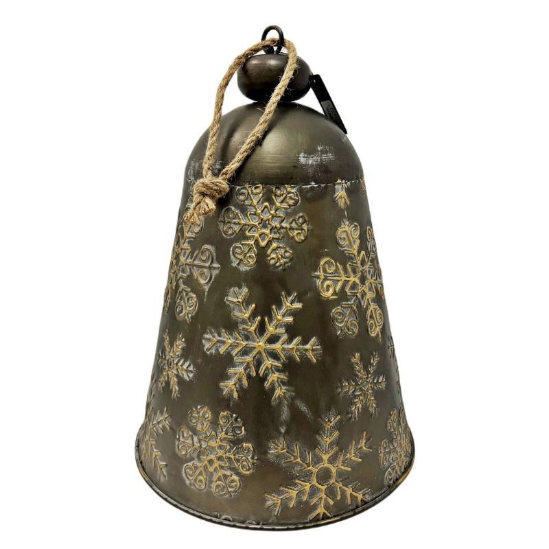 Metalowy dzwon dekoracyjny ze świątecznym motywem.