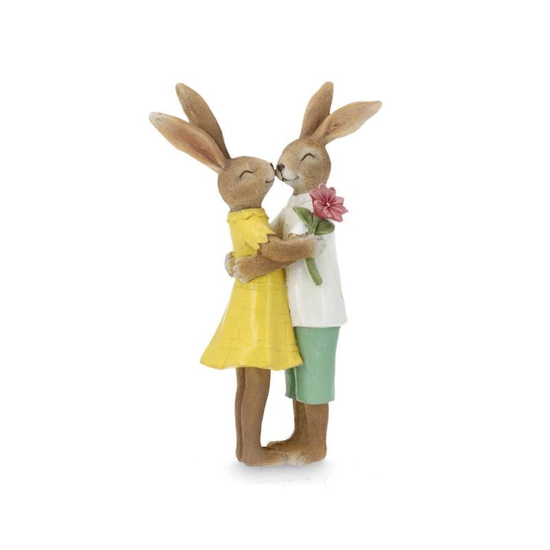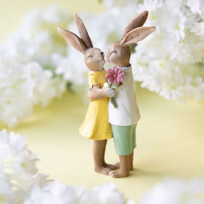 Urocza figurka pary królików przytulających się z wiosennymi kwiatami.