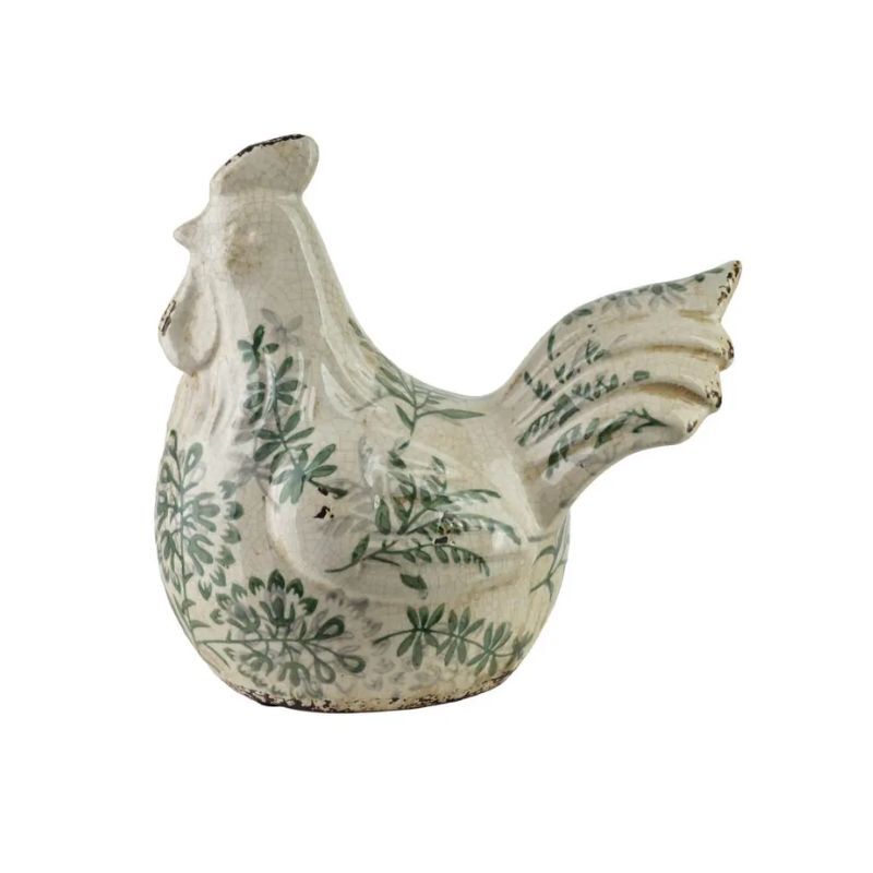 Ceramiczna figura kury wykonana z ceramiki. Powierzchnię zdobią piękne zielone, roślinne motywy, które nadają figurze naturalny i dekoracyjny charakter, idealny do wnętrz i przestrzeni zewnętrznych. Figura jest efektowną ozdobą domu, salonu, kuchni, tarasu lub balkonu, wprowadzając do otoczenia przytulny, przyrodniczy akcent.