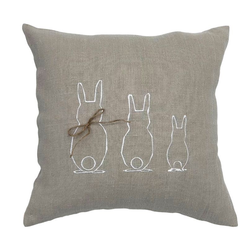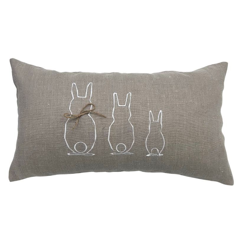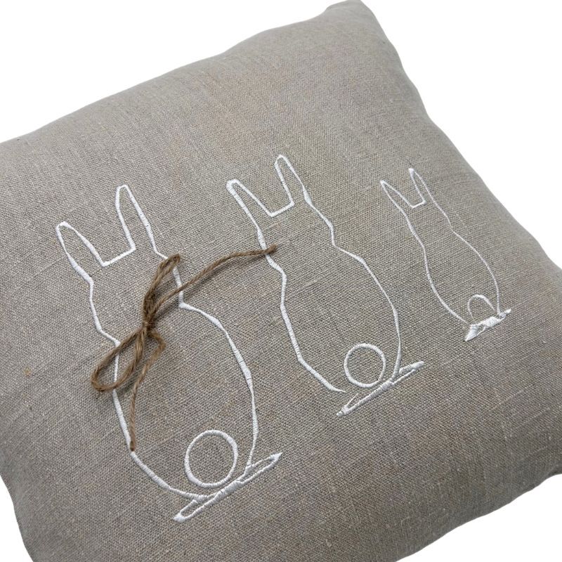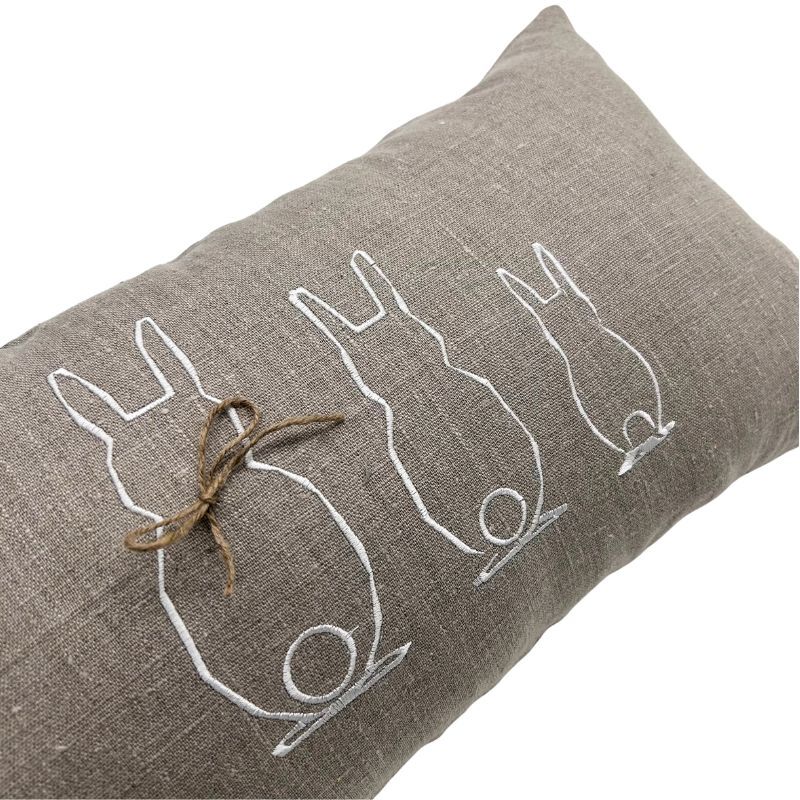 Naturalna, subtelna i pełna uroku lniana poszewka dekoracyjna z delikatnym haftem trzech królików to wyjątkowy dodatek do wnętrz w stylu skandynawskim, rustykalnym i boho.