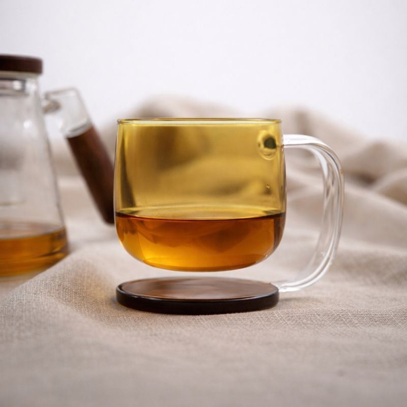 Kubek z linii SŁAWOSZ wykonany ze szkła borokrzemowego w ciepłym, bursztynowym odcieniu, odporny na wysokie temperatury i wyjątkowo lekki.
